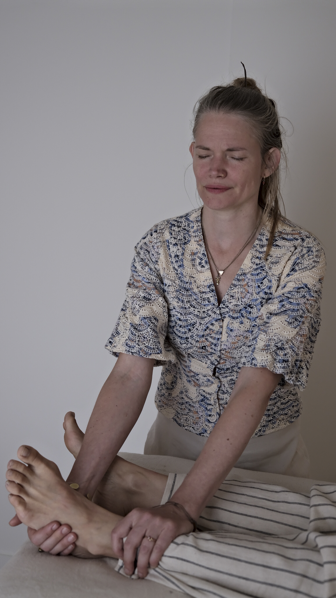 Als healer leg ik de handen op de voeten, de knieën en de 5 chakra punten.